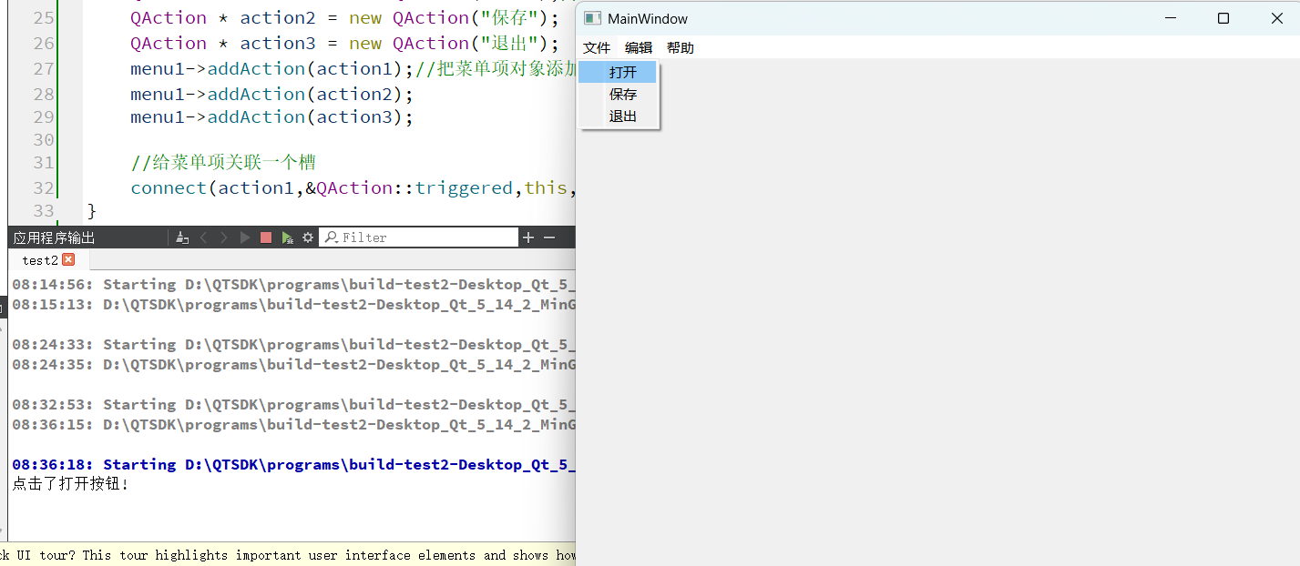 添加菜单栏,添加菜单,添加菜单项,并为菜单项设置触发事件(槽函数)