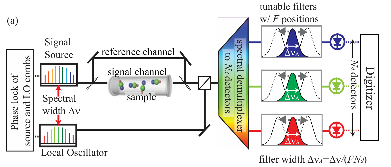 图 1. (a)双梳光谱仪布局示意图,包括顺序或并行数据采集的可能性。图中,信号和参考采用时分复用 [7,8],但参考也可在单独的干涉仪 [6] 中采集,或通过空样品池顺序采集。