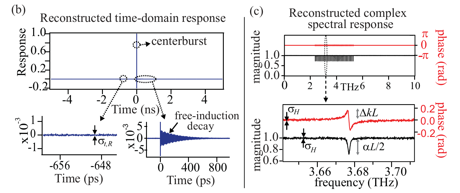 图 1. (b)模拟时域信号与有效下变频时间(非实验室时间)的关系。(c)在 10 太赫兹带宽、100 兆赫兹分辨率下(M=100,000个分辨元素)对应的频域样品响应。为便于说明,假设样品具有 20 条等间距、宽度为 2 吉赫兹的洛伦兹跃迁线,频域信噪比为$\\sigma_H^{−1}=100$。在时域中,相应信号为单边干涉图,包含两个分量:中心脉冲和尾随的自由感应衰减信号。在频域中,每条跃迁线的幅度和相位都得到了高分辨率的分辨。