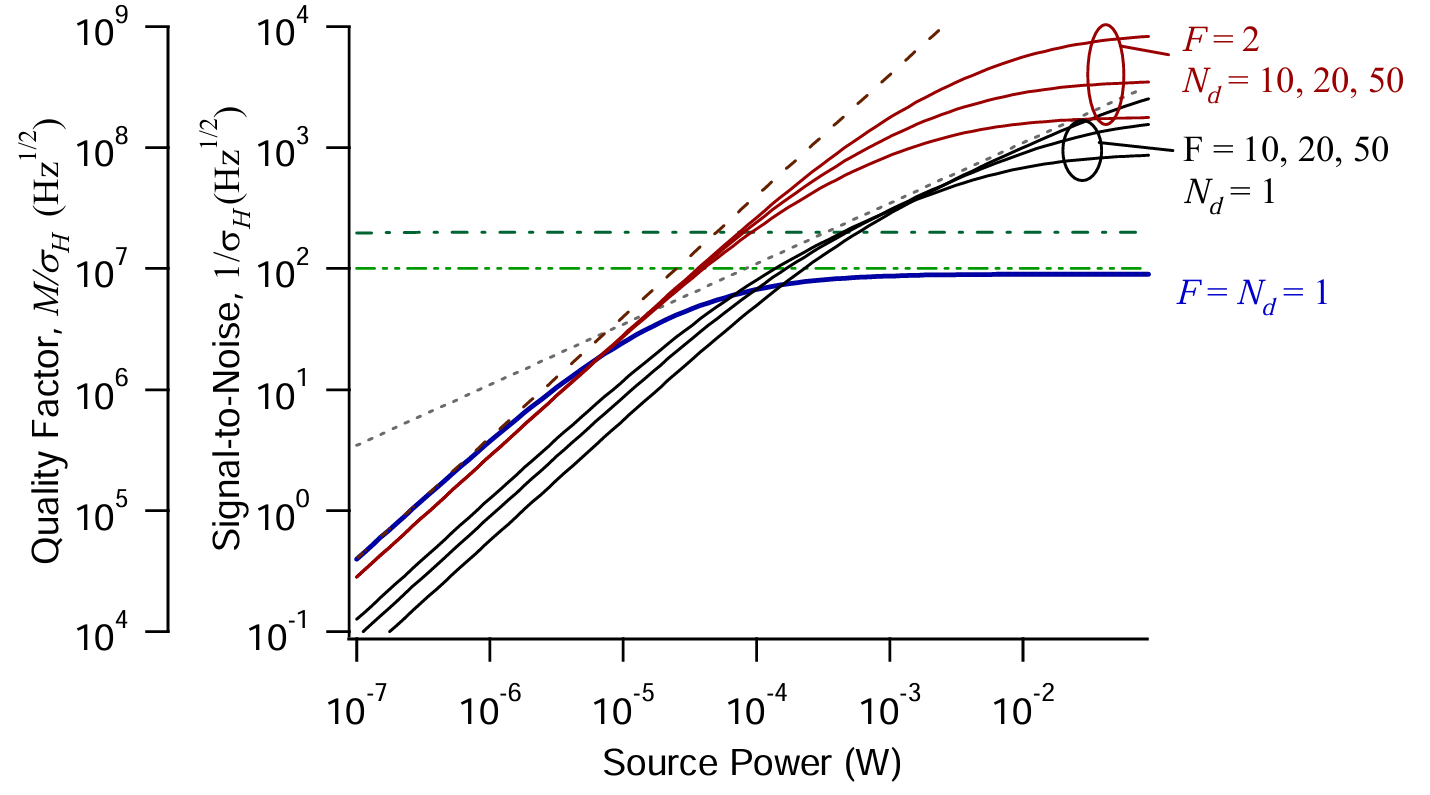 \\begin{equation} \\frac{M}{\\sigma_H} = 0.8 \\frac{N_d \\sqrt{T}}{\\sqrt{\\varepsilon}} \\sqrt{\\frac{F}{2 RIN + 8 D^{-2} f_r^{-1}}} \\tag{3} \\end{equation}