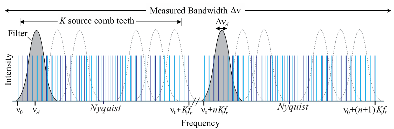 图 4. 计算中涉及的不同光频示意图。浅蓝色(深蓝色)线表示源光梳(本地振荡器(LO)光梳)齿,其重复频率差为Δfr。总测量带宽为Δv,但对于任何给定的干涉图,带宽通过滤波器滤波至ΔvA(可通过滤波器在光谱上顺序调谐,或通过固定滤波器组并行调谐至多个探测器,或两者结合)。注意射频拍频位于零频率或奈奎斯特频率处的 “死区”;在这些滤波器位置,需对一束源光进行整体频移 [7,8]。