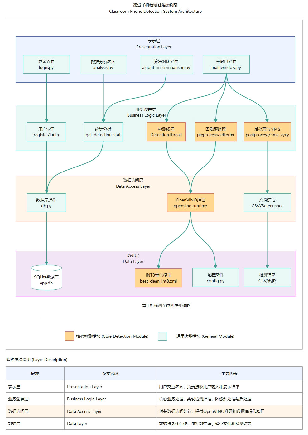 针对课堂手机使用行为难以有效监管的问题,本文设计并实现了一种基于改进YOLOv5n与OpenVINO加速的课堂手机检测系统。该系统旨在通过深度学习技术自动识别课堂中的手机使用行为,为课堂管理提供智能化辅助手段。