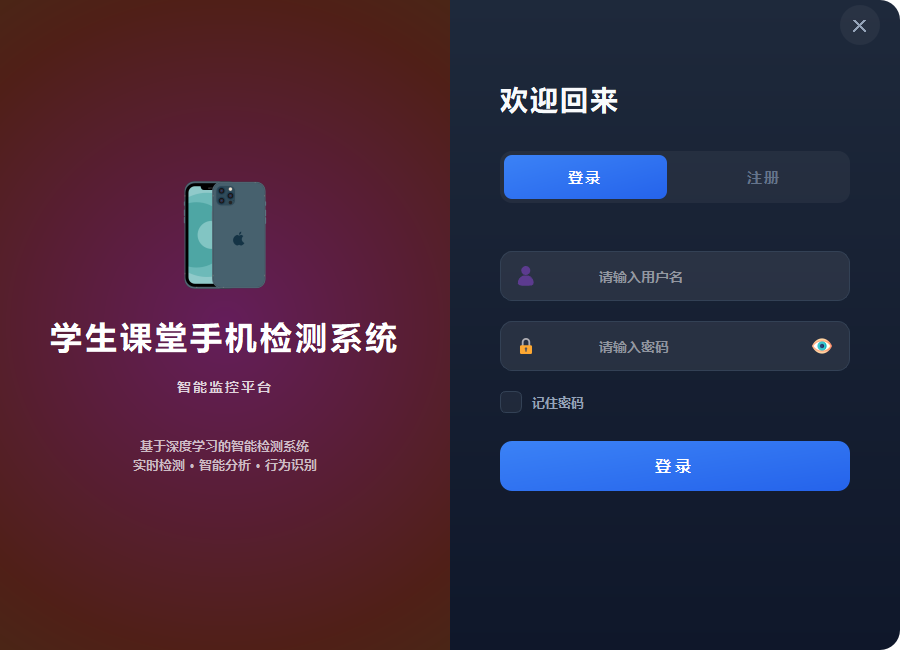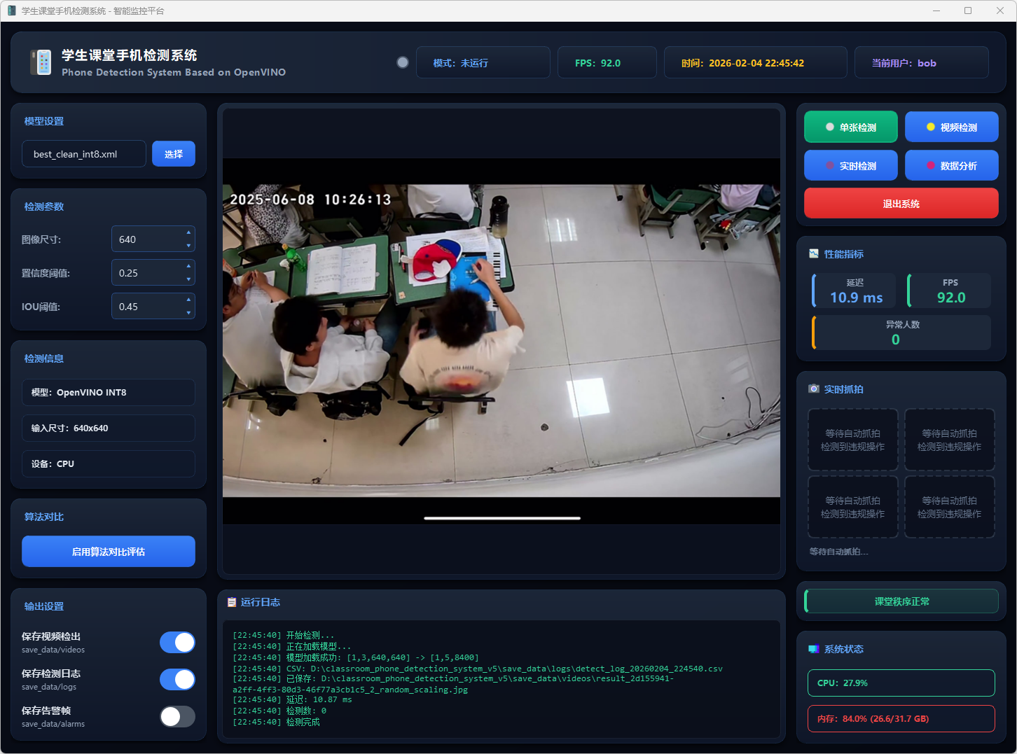 本系统基于 YOLOv5n 轻量化模型,实现课堂手机使用行为的智能识别与分析,在验证集上取得 mAP@0.5 为 98.46%、mAP@0.5:0.95 为 89.04% 的检测精度。模型参数量仅 1.9M、计算量 4.5 GFLOPs,适合边缘设备部署。系统支持实时视频流处理,集成 OpenVINO 加速,兼容 CPU/GPU 多平台,并提供图片、视频和实时摄像头三种识别模式,配备数据统计与可视化功能,满足课堂监控应用需求。