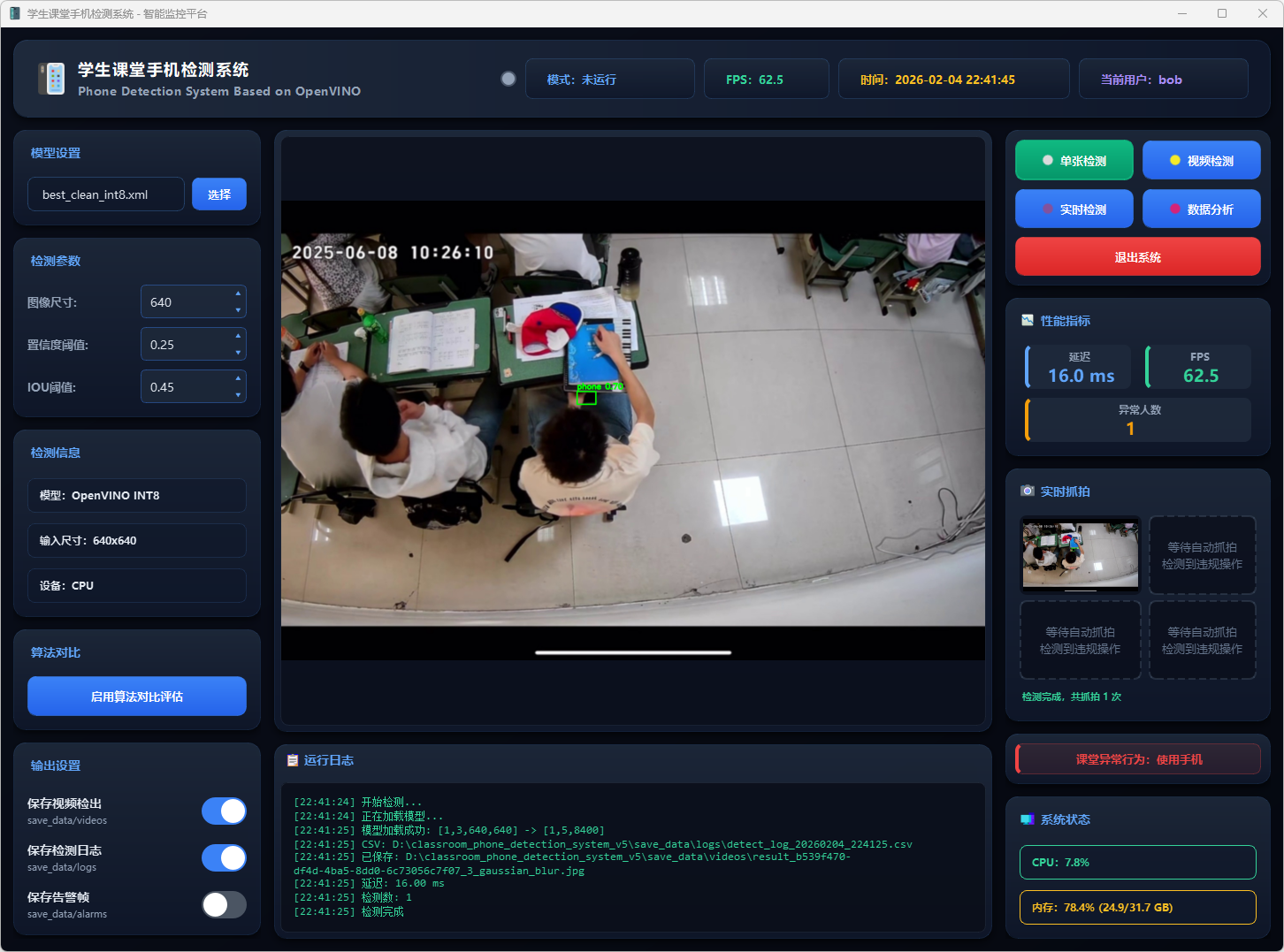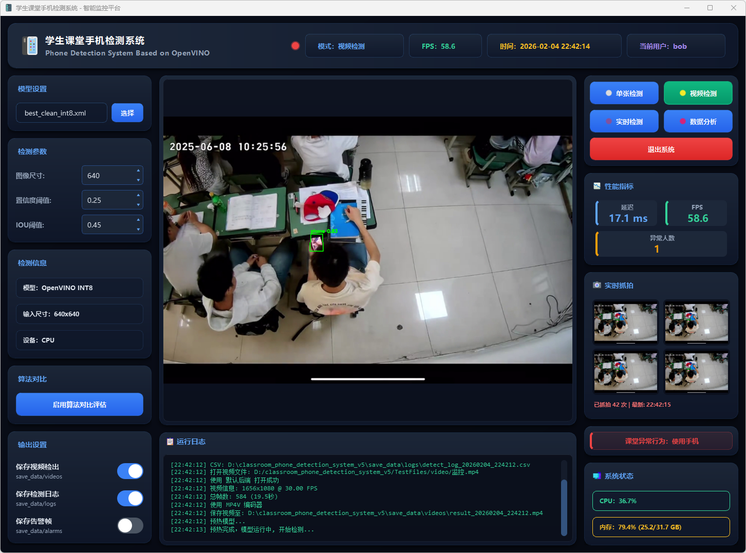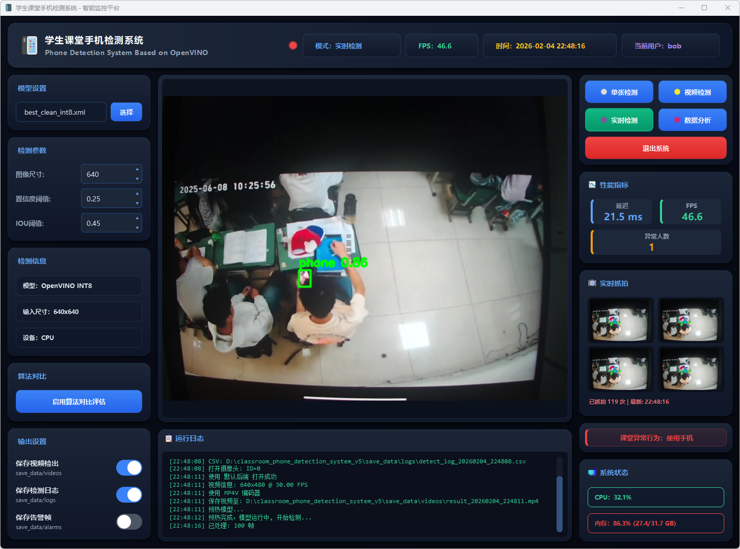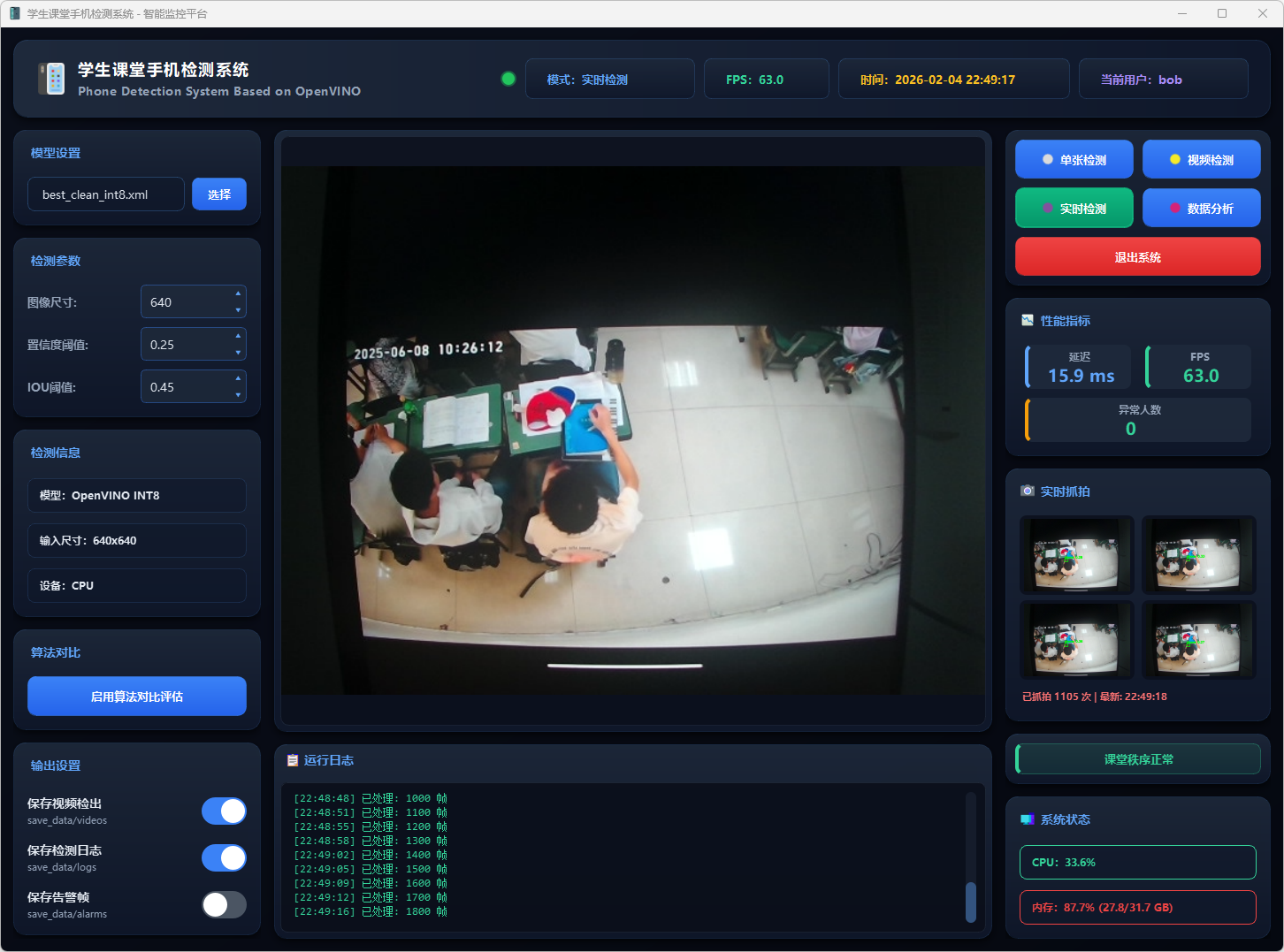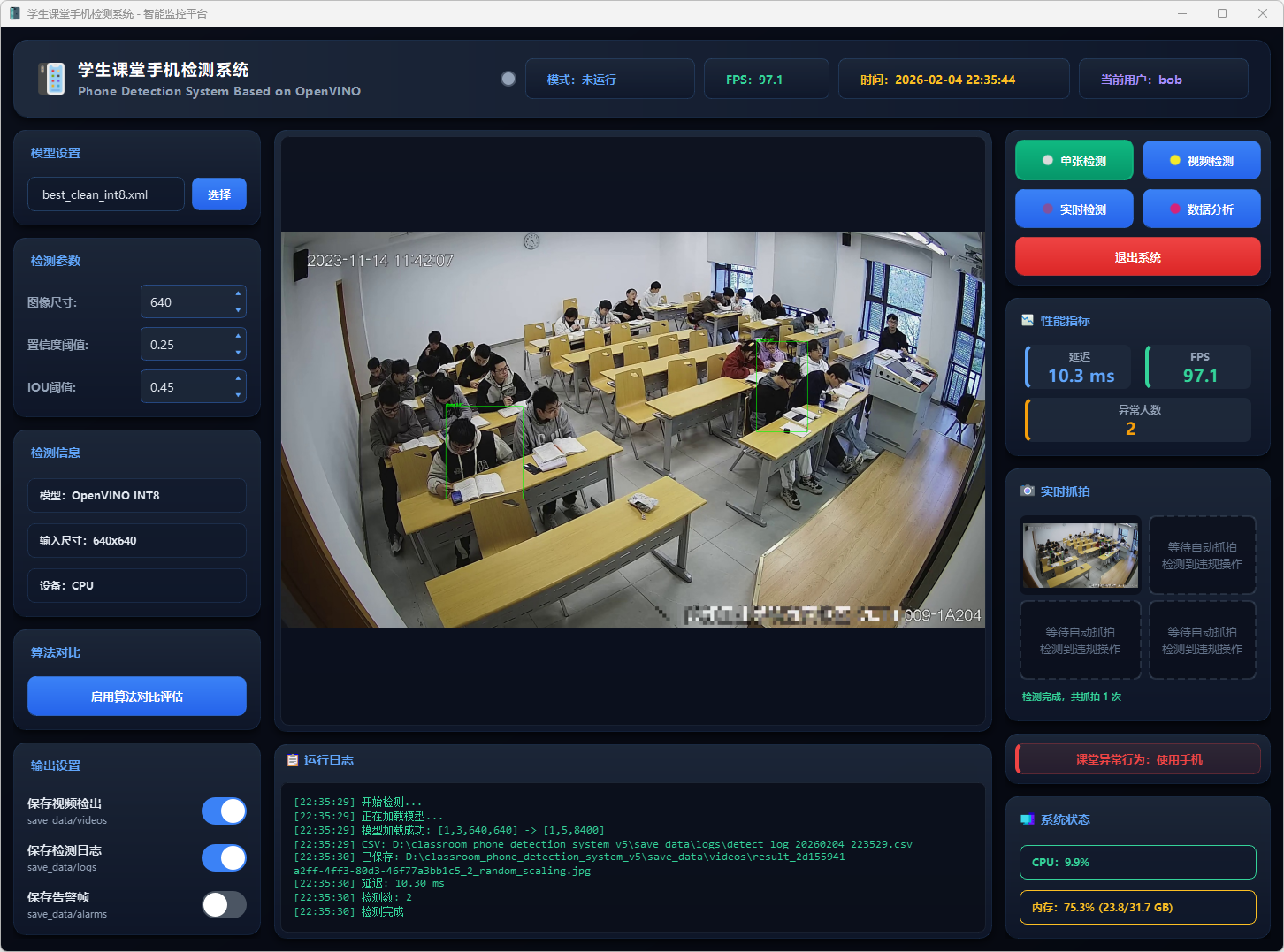 基于改进YOLOv5n与OpenVINO加速的课堂手机实时检测系统,支持单张图片、视频文件及摄像头多模式检测,可自动记录并导出检测结果。