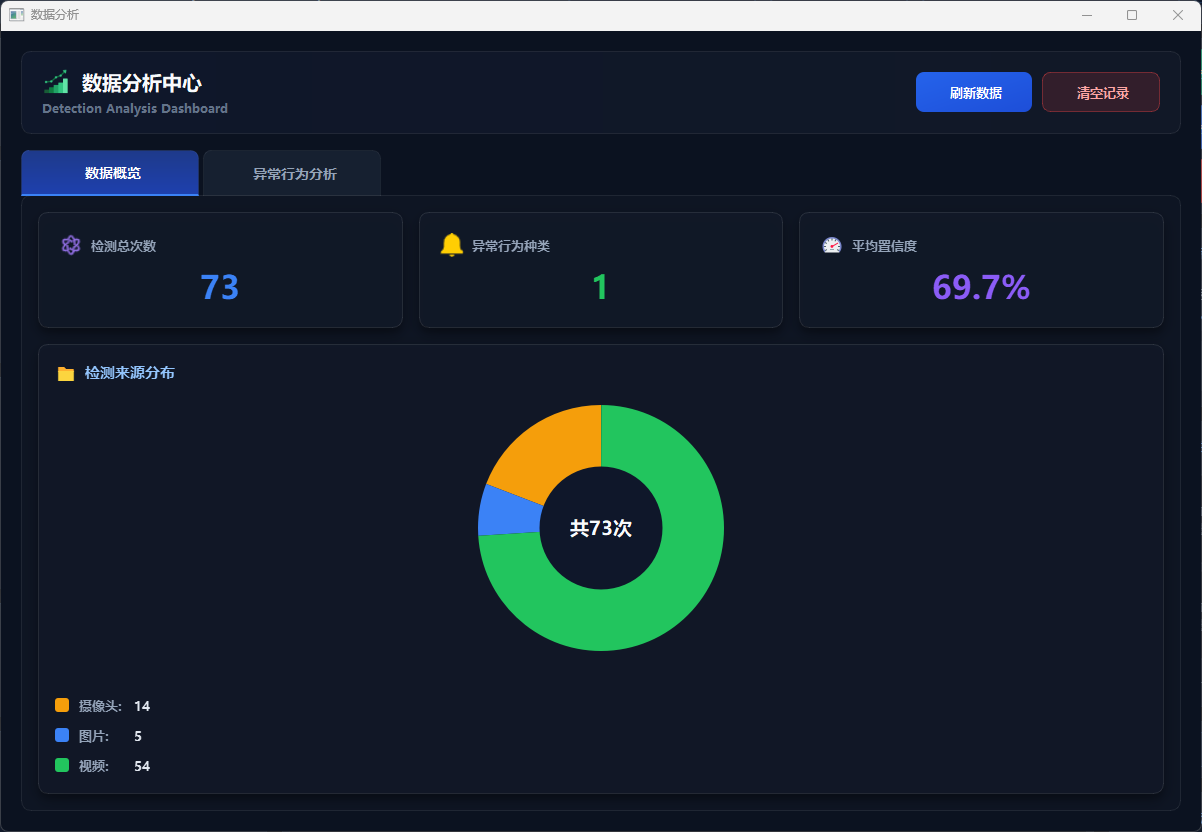 数据分析模块提供识别数据的可视化展示与统计分析功能。用户点击“数据分析”按钮即可打开独立分析窗口,查看检测总次数、检测频次、平均置信度等关键指标,并通过条形图、饼图和统计卡片等形式直观展示数据分布。模块包含数据概览、检测分析和详细统计等标签页,支持查询存储于 SQLite 数据库中的历史识别记录,查看检测来源分布(视频、摄像头、图片),并支持清空当前用户记录,实现识别数据的持久化存储与综合分析。