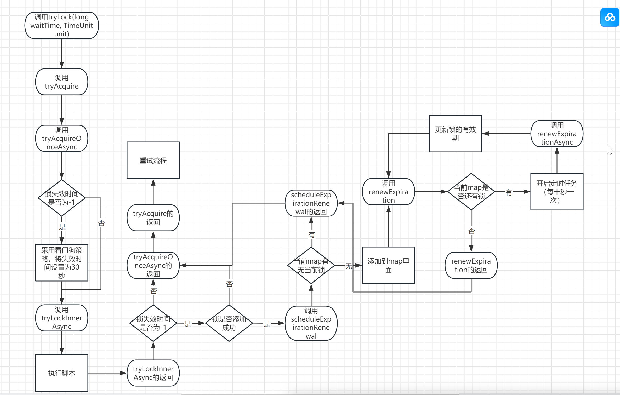 开启续命当调用 tryLock 且未指定 leaseTime(即 leaseTime = -1)时,锁获取成功后会触发 scheduleExpirationRenewal,开启看门狗。