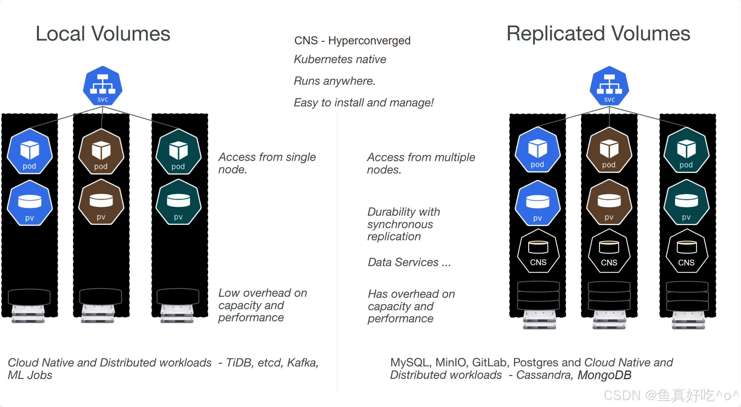 在上述的所有场景中,其实Local Volumes和Replicated Volumes是两种存储类型,是可以分开部署的。