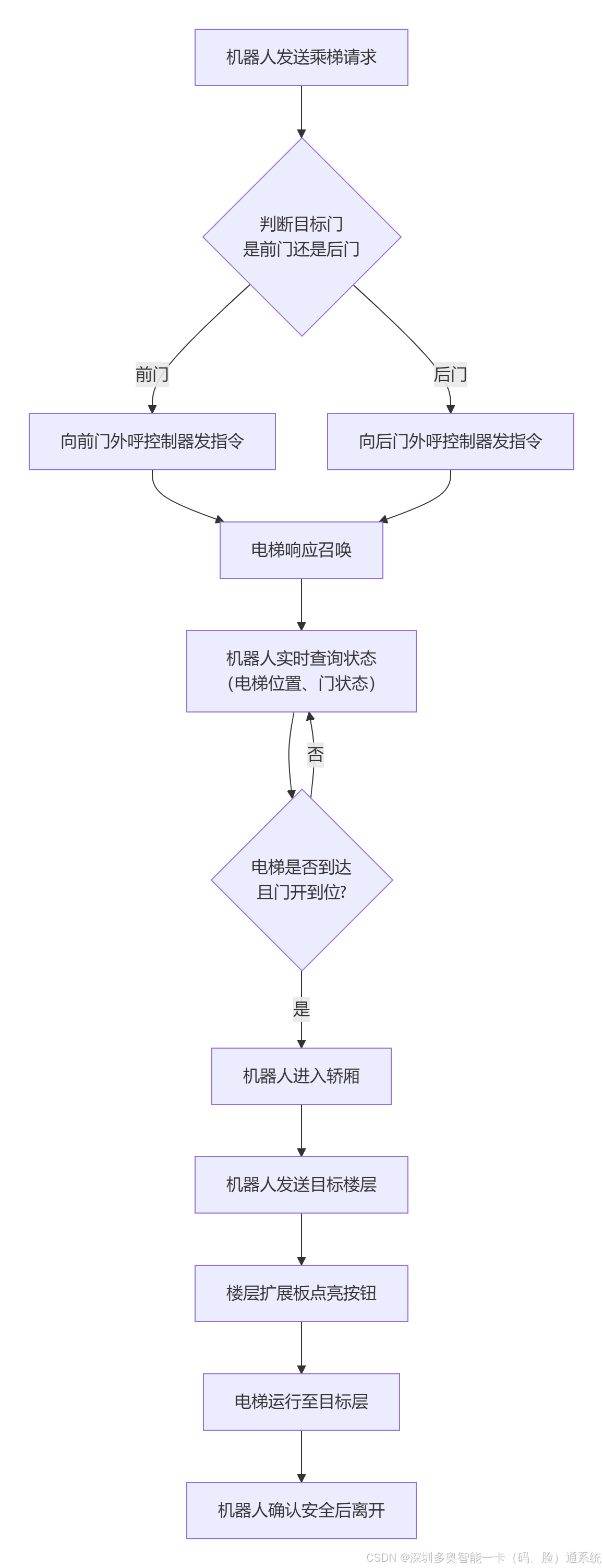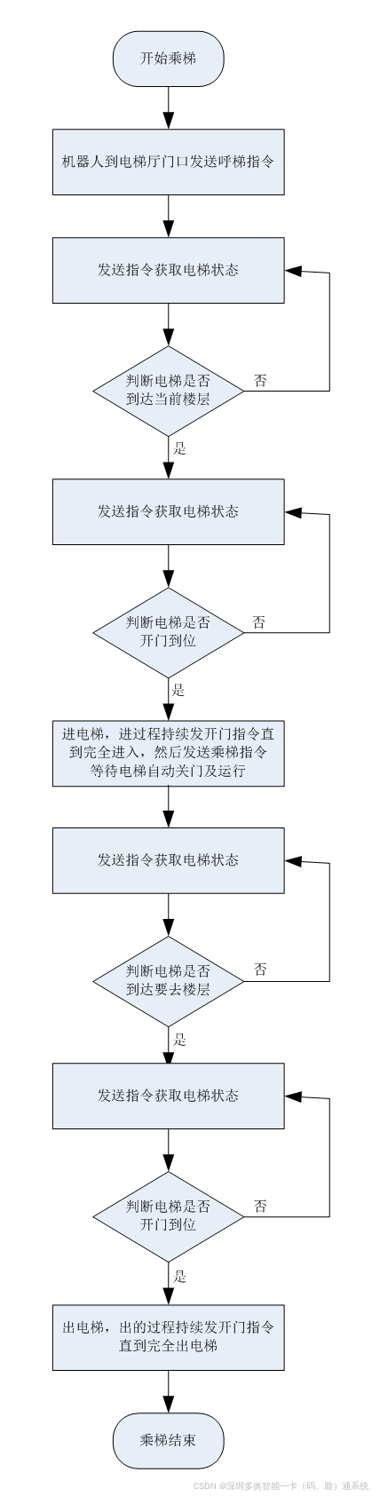 状态校验:机器人必须实时读取电梯状态(运行方向、楼层、门状态),确认方向正确且门已完全打开。