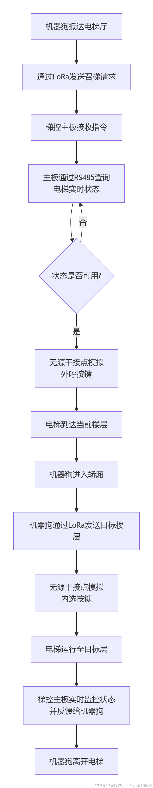 | 实时状态监控 | 通过梯控反馈的"上下行、楼层、门状态"决定机器人动作 |