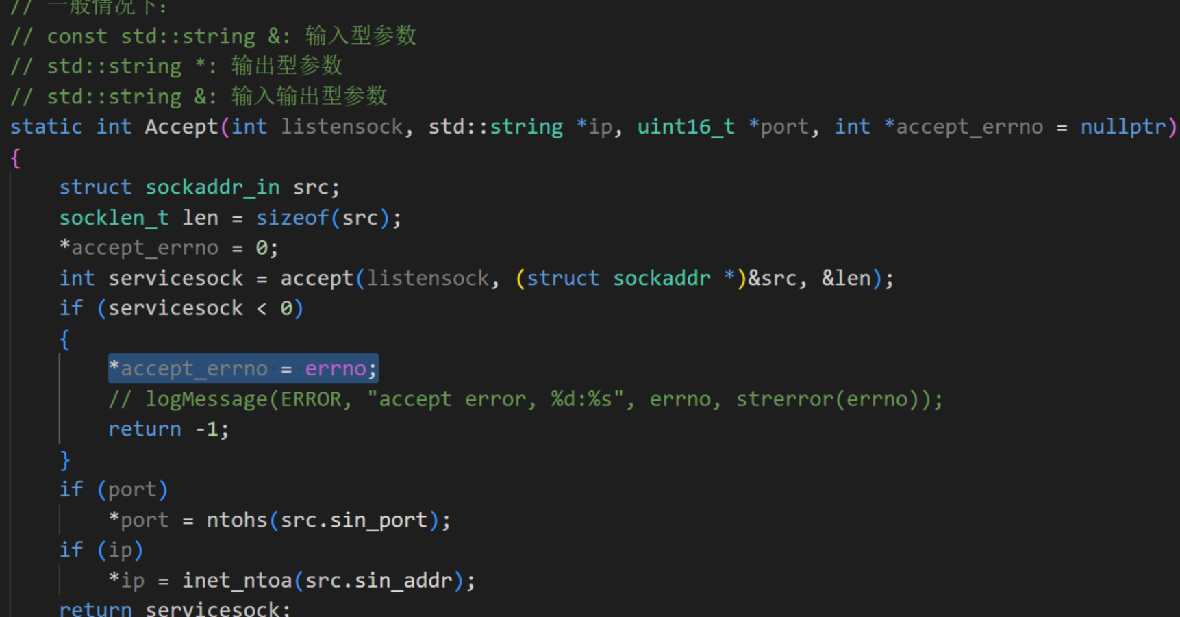 写到TcpServer.hpp的Accepter函数再改一下Sock.hpp的Accept:(加一个输出错误码的参数)