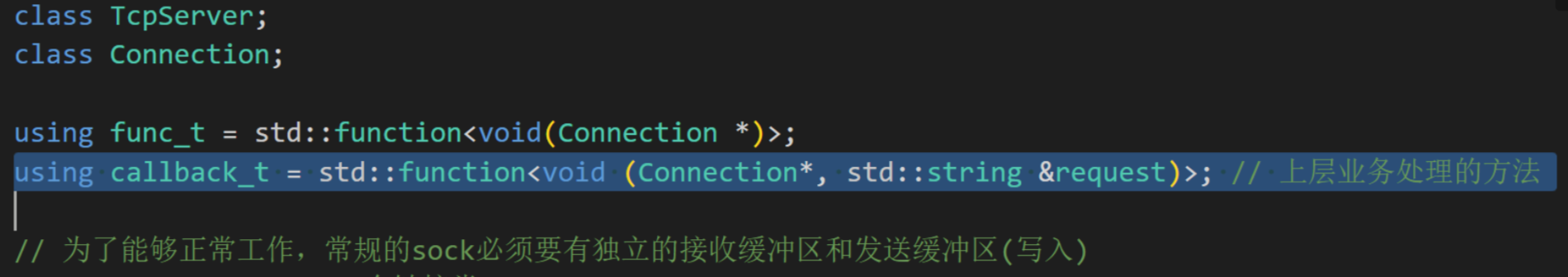 using callback_t = std::function<void (Connection*, std::string &request)>; // 上层业务处理的方法