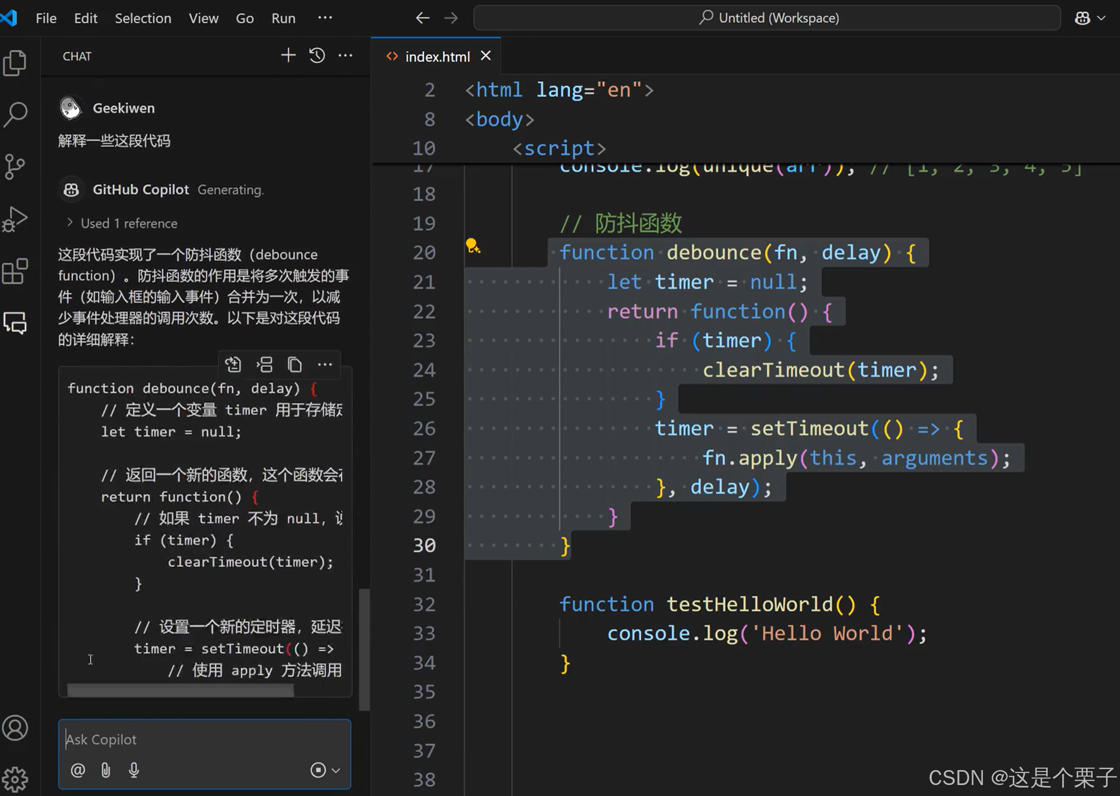 安装完成后,你就可以开始使用了。Copilot 主要通过两种方式辅助你:行内代码补全 和 Copilot Chat 对话。