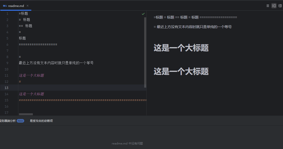 在标题文本下方添加“=”等号(等于号 =),在标题文本最近的下方添加等号,且标题文本最近的上方无内容,那么等号上面的文本就成为了一个大标题,等号数量最少一个,暂无等号个数限制;