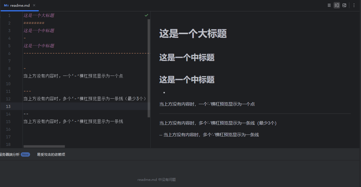 在标题文本下方添加“-”横杠(横杠 -),在标题文本最近的下方添加横杠,那么横杠上面的文本就成为了一个中标题,横杠数量最少一个,暂无个数限制;当横杠最近的上方没有文本内容时,一个横杠显示预览为一个圆点,最少三个横杠时显示预览为一条直线;