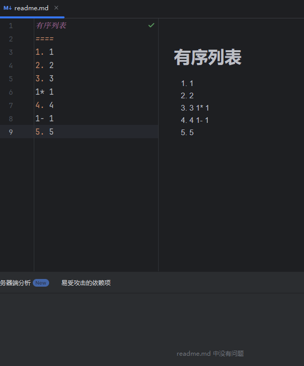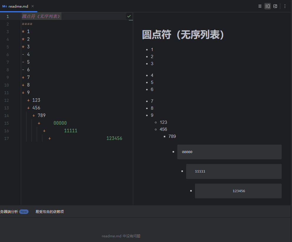 圆点符号:使一个 * 星号、 – 横杠 或者 + 加号 再使用一个字符空格隔开即可形成无序列表,形成层级缩进(*Space 、 -Space 、 +Space);后续层级可使用 tab 键分开,使用两个及以上时可高亮显示;