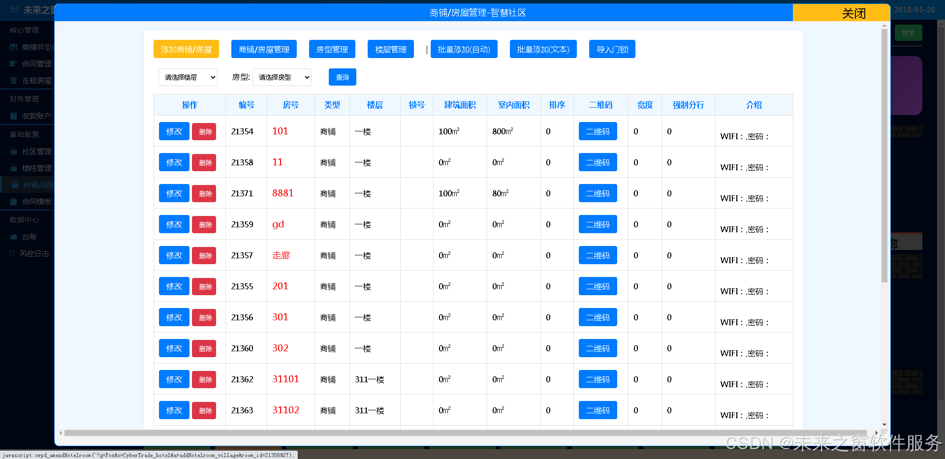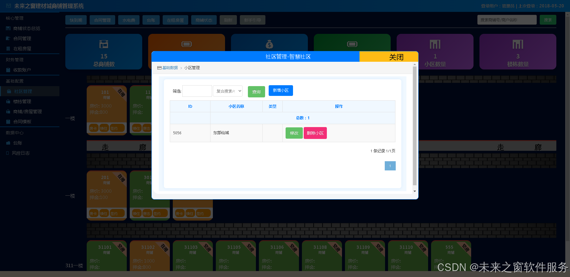 在小区 / 地段下进一步细化楼栋结构,支持楼栋新增、编辑、排序与备注管理。每栋楼可关联对应商铺与房屋,形成 “地段 — 楼栋 — 商铺” 层级结构。便于按楼栋快速定位资产、统计出租情况、安排巡检与维护,让空间管理更清晰、更有条理