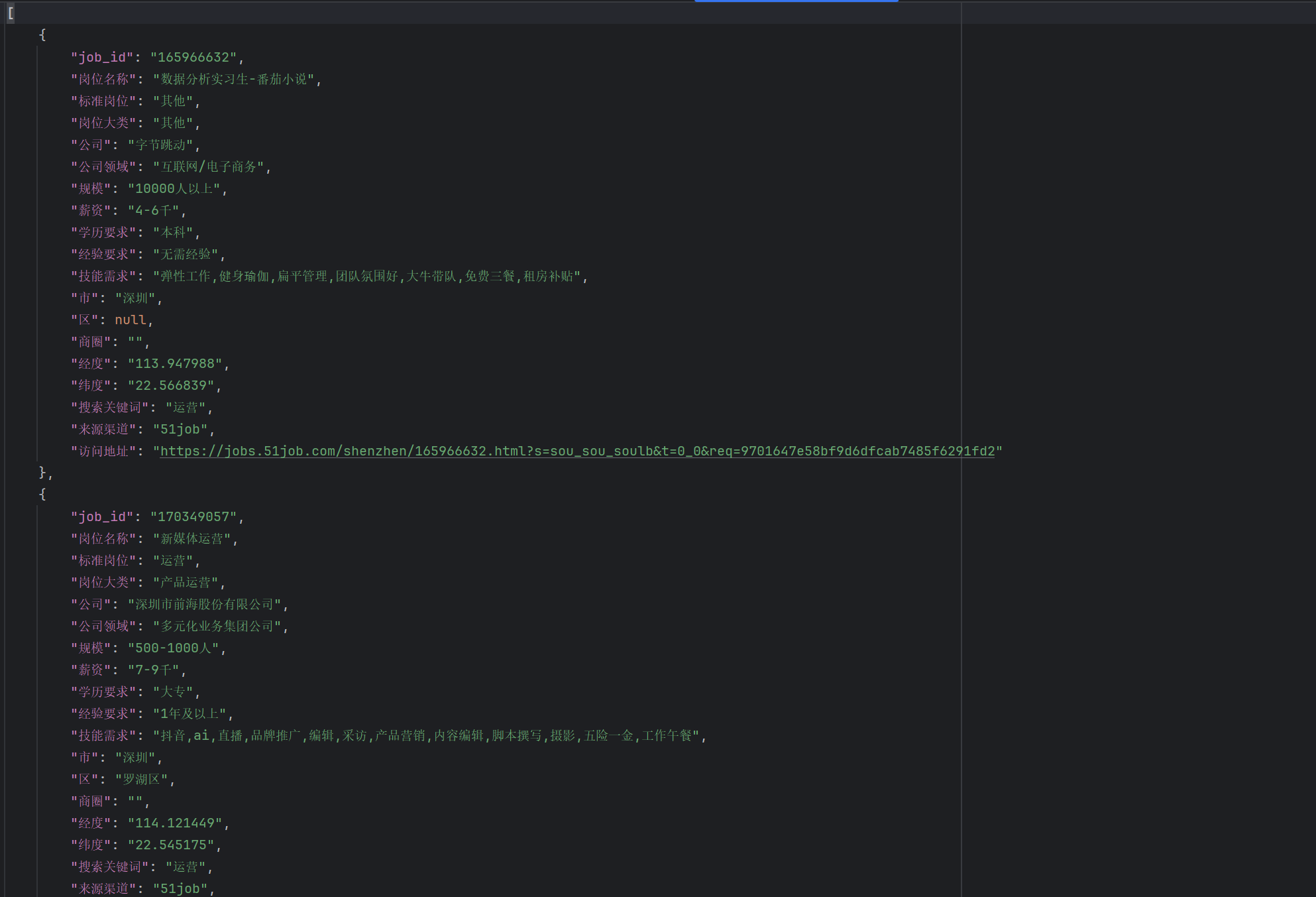 - 数据去重:基于job_id或 “岗位名称 + 公司 + 薪资” 去重,避免重复数据;
