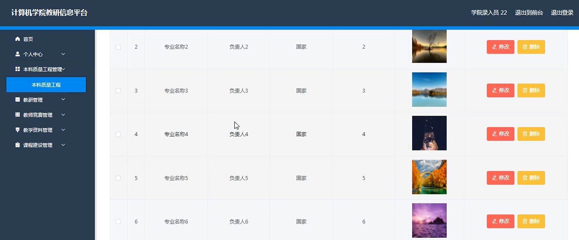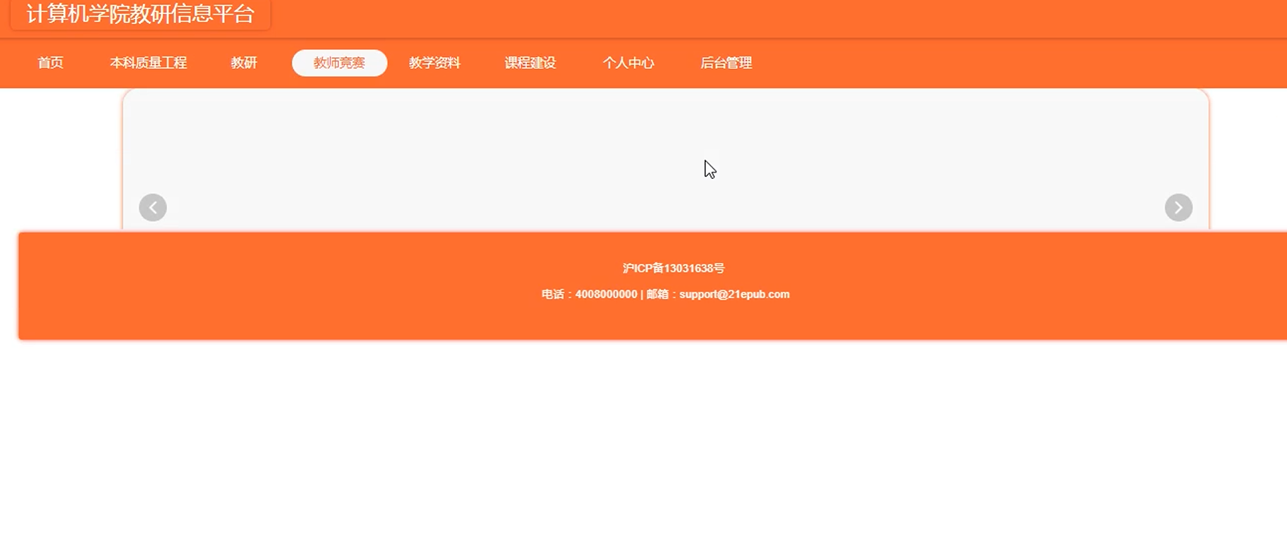 项目功能:教师,系主任,院级领导,学院录入员,本科质量工程,教研,教师竞赛,教学资料,课程建设,教师个人信息,教师教学综合评定,教师教研综合评定,教师综合排名,平台公告