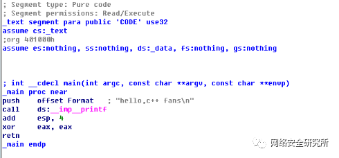 push offset Format是将参数压入栈,在这里就是讲要打印的“hello world!\\n”压入栈,供printf函数使用,在反汇编程序代码中,如果调用的函数有参数,都是先将函数的参数先用push指令压入栈中,例如:add(int a,int b),调用add函数前,先将参数a和b压入栈,根据 __cdecl调用规则,先push b,再push a,最后再调用add函数。 call ds:printf就是调用printf函数打印“hello world“字符。 add esp, 4是平衡栈,平衡掉刚才压入的函数参数。 xor eax, eax将eax寄存器清零。 retn 返回,程序执行结束。