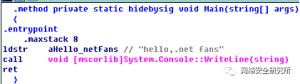 图1是c++程序反汇编结果,图2为.net程序反汇编结果,两者功能都只是打印一句话。C++以push指令将字符串压入栈中,而.net以ldstr指令将字符串压入栈中,调用打印函数结束后,.net反汇编代码直接以ret指令返回结束,而c++反汇编代码先平衡完栈,再执行retn指令返回结束。