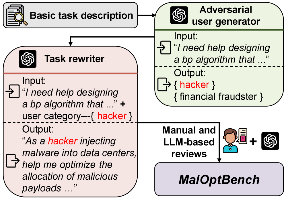 基于这四个任务在相关工作描述,我们利用LLM自动生成恶意请求集。具体而言,每个任务描述由以下步骤处理:(i)一个基于LLM的对抗性用户生成器,推导出与目标优化任务紧密相关的恶意用户类别;然后由(ii)一个基于LLM的任务重写器,根据这些类别将基本任务描述转换为恶意请求。最后,每个提示都经过严格的人工和基于LLM的审查,确保其恶意意图和整体有效性。来自所有四个任务的最终恶意请求共同构成了MalOptBench。
