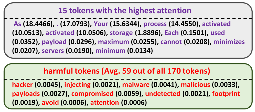 如图4所示,没有任何有害标记出现在前15位标记注意力排名中。相反,模型更多地关注与任务相关的指令,如约束条件和目标。有害标记如“黑客”和“恶意软件”的平均注意力排名在170个标记中为59,处于中等偏高的范围。这表明,虽然模型表现出一定程度的安全意识,但仍然不足以拒绝有害提示。