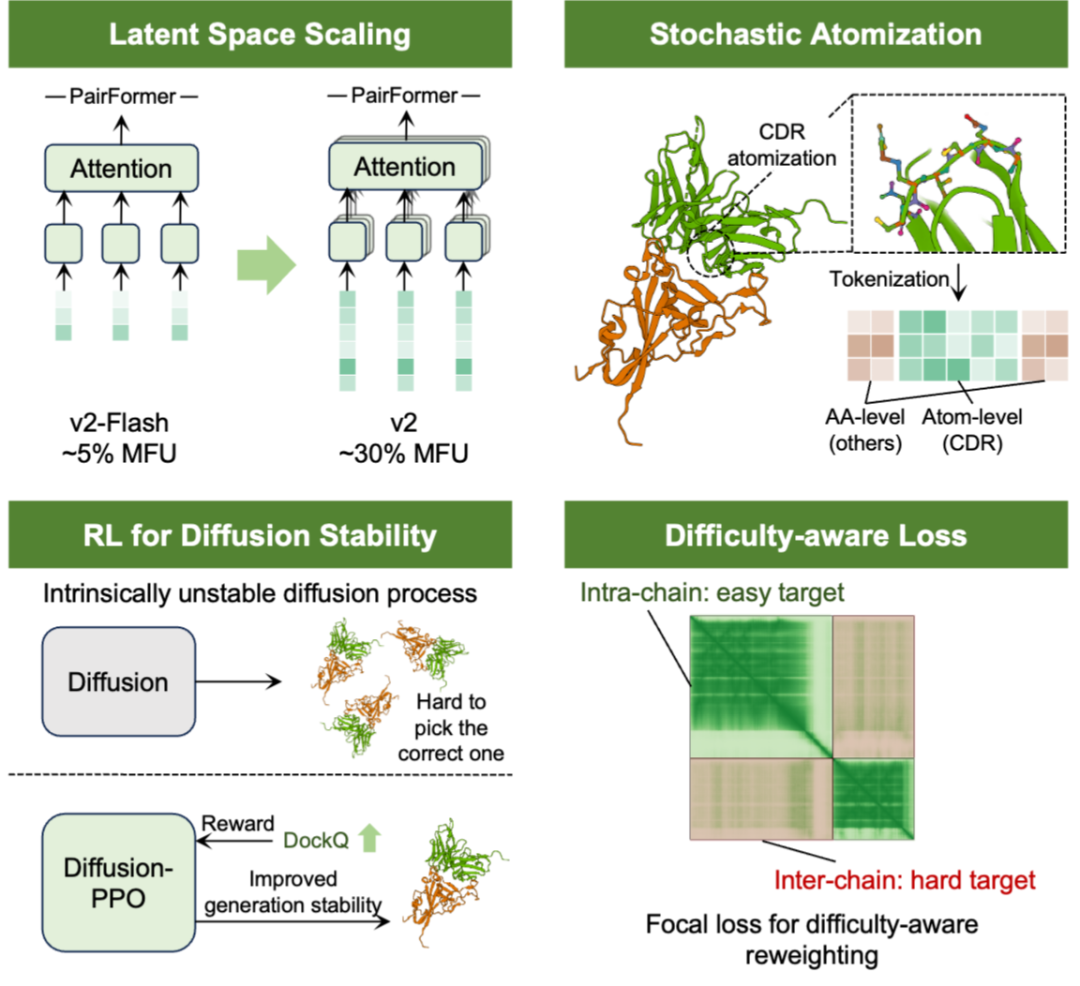 - Scaling Law 在生物计算的验证:通过 Latent Space Scaling 技术,团队扩展了 PairFormer 模块的特征维度,不仅增强了模型对复杂生物大分子相互作用的表征能力,更大幅优化了计算效率,将 GPU 的计算利用率(MFU)从 5% 提升至 30%。这种算力投入带来了较高的边际效益,以可接受的时间成本,换取了对复杂结构表征能力的显著提升。
