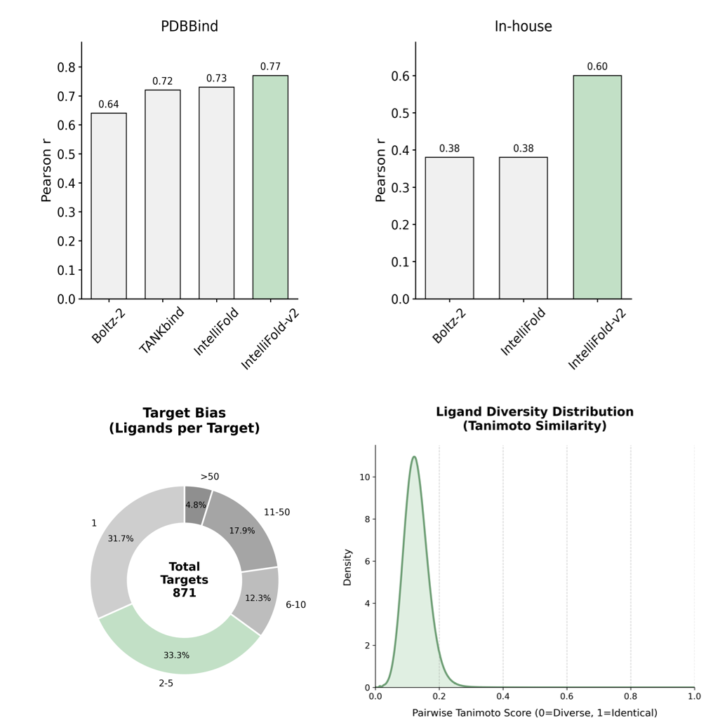 IntelliFold 2 延续了初版的高保真亲和力预测能力,不但在 PDBBind 数据集性能优于 Boltz-2 及模型初代版本,还在更接近产业真实任务的复杂 In-house 数据集上亲和力预测表现(Pearson r = 0.60)显著领先 Boltz-2 等开源模型 (0.38)。结合 IntelliFold 特有的别构和表位分析能力,已经形成 “预测结构→估计结合→指导设计” 的完整闭环,并在真实案例中帮助合作伙伴在分子筛选任务上实现了效率与精度的大幅提升以及高难靶点的突破进展。