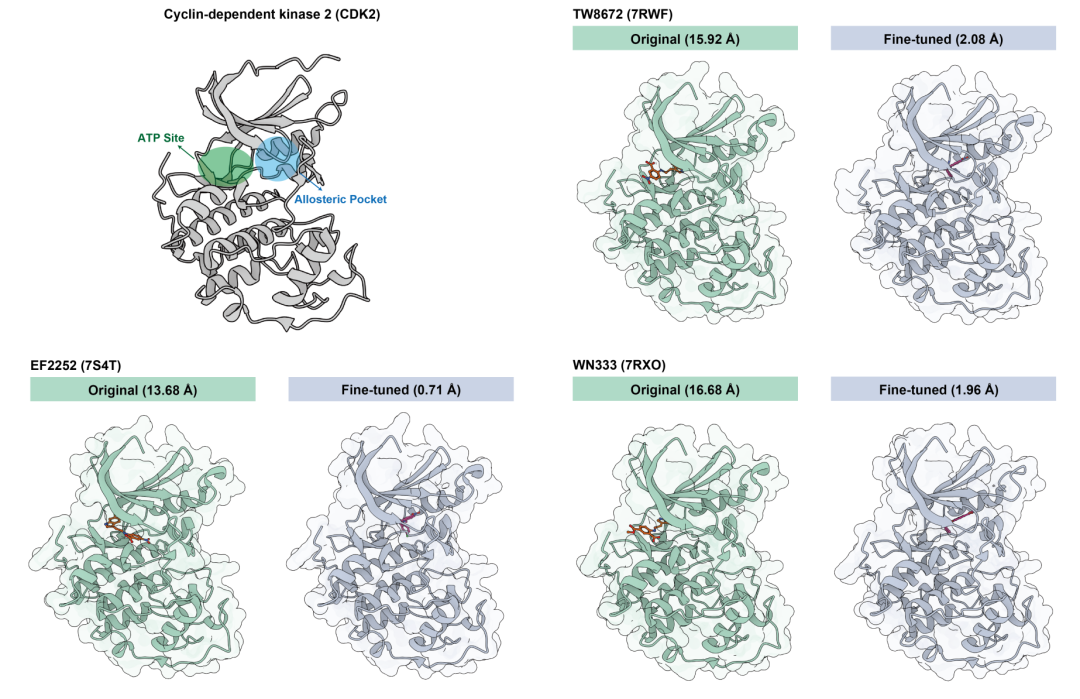 IntelliFold 2 构建了一套 “微观原子精度” 与 “宏观构象一致性” 协同的表征体系:在微观层面,它能以原子级分辨率捕捉氨基酸侧链的细微偏移;在宏观层面,则能维持蛋白质整体拓扑结构的物理合理性。以此通用表征为基石,通过针对性地引入别构数据进行高效微调,模型进一步习得了解析复杂别构效应的能力。