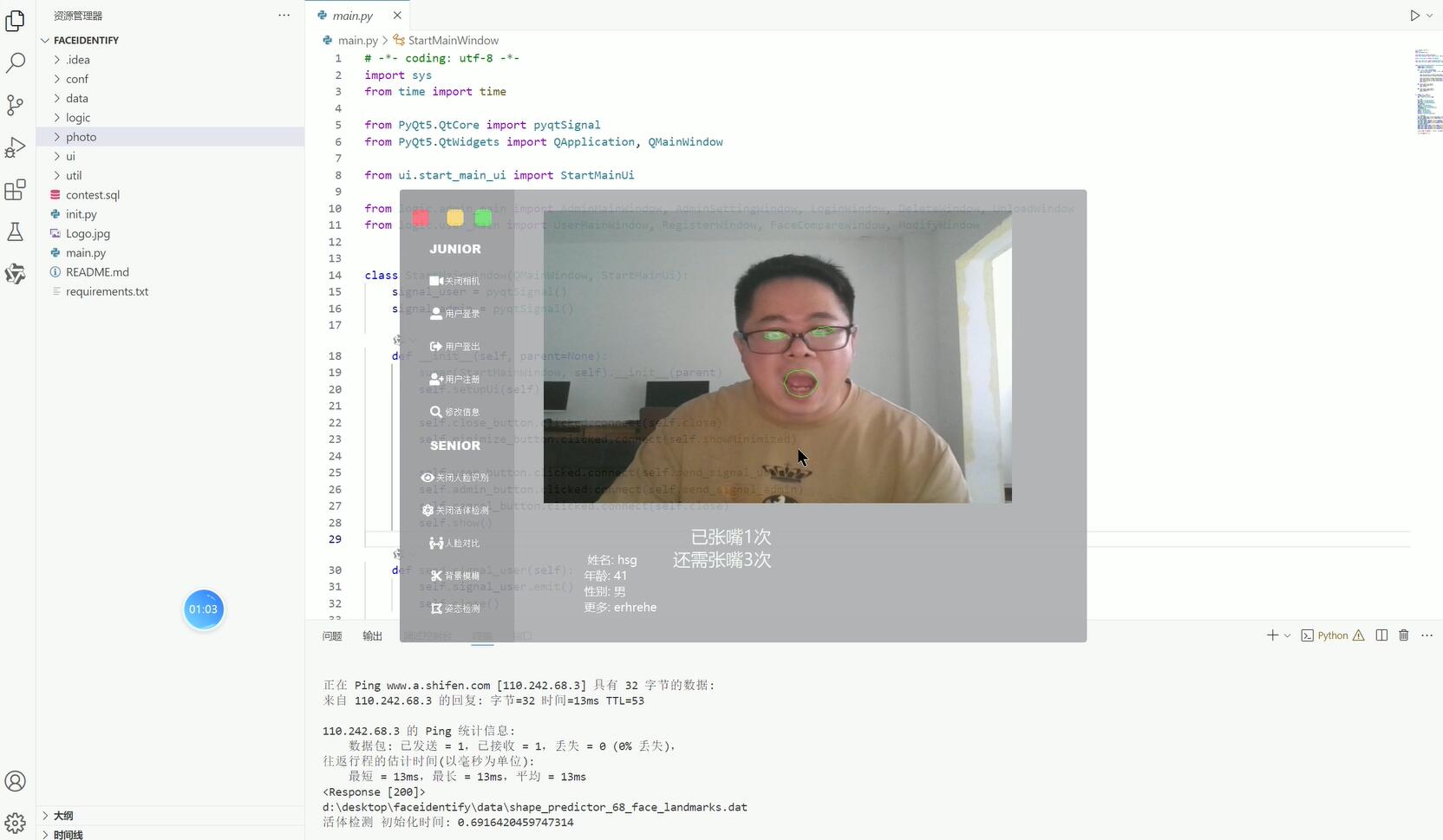 人脸识别功能:对于检测到的人脸,系统能够与预先录入的人脸数据库进行比对,识别出人脸对应的身份信息。