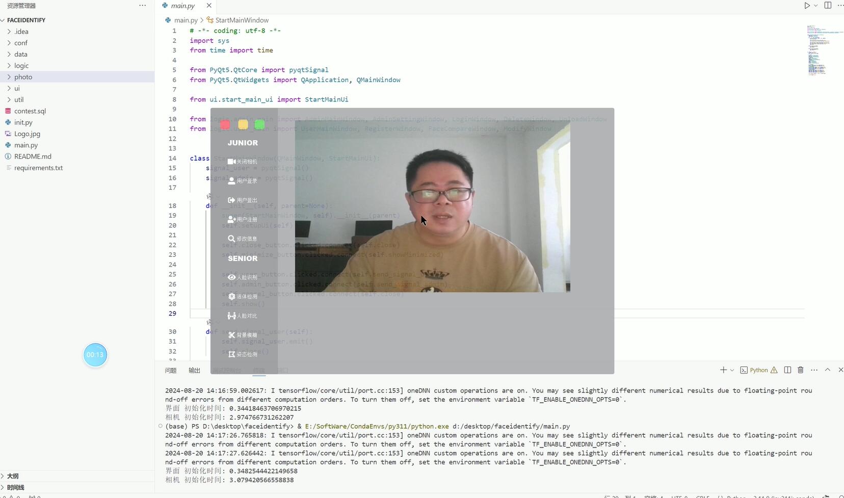 录像功能:当系统检测到人脸时,自动开始录像,并将录像文件保存到指定位置。录像文件应包含检测到的人脸信息以及对应的身份信息(如果识别成功)。