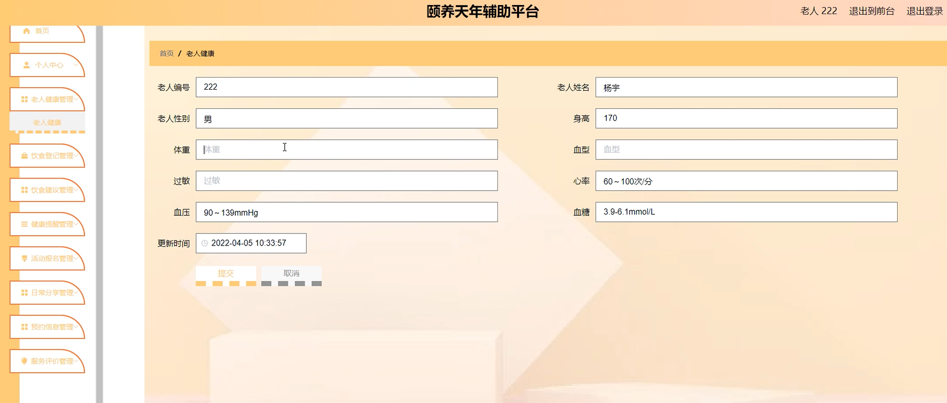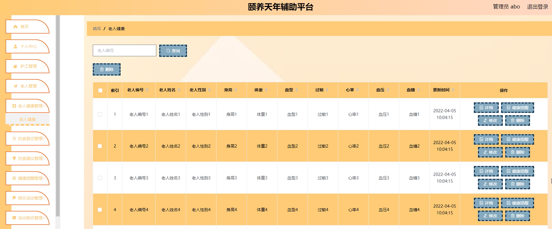 项目功能:老人,老人健康,饮食登记,饮食建议,健康提醒,娱乐活动,活动报名,日常分享,护工,预约信息,服务评价,高德地图