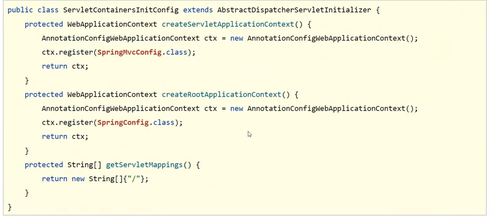 createRootApplicationContext()方法,如果创建Servlet容器时需要加载非SpringrVC对应的bean,使用当前方法进行,使用方式同createServletApplicationContext() protected WebApplicationContext createRootApplicationContext() {return null;