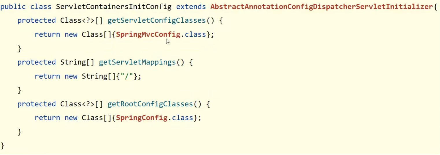 4.初始化Servlet容器,加载SpringMVc环境,并设置SpringMVc技术处理的请求(一次性操作) public class ServletContainersInitConfig extends AbstractDispatcherServletInitializer {protected WebApplicationContext createServletApplicationContext(),初始化容器并注册配置类 {AnnotationConfigWebApplicationContext ctx = new AnnotationConfigWebApplicationContext();ctx.register(SpringMvcConfig.class); return ctx; protected String[] getServletMappings() {return new String[]{"/"}; protected WebApplicationContext createRootApplicationContext() {return null;