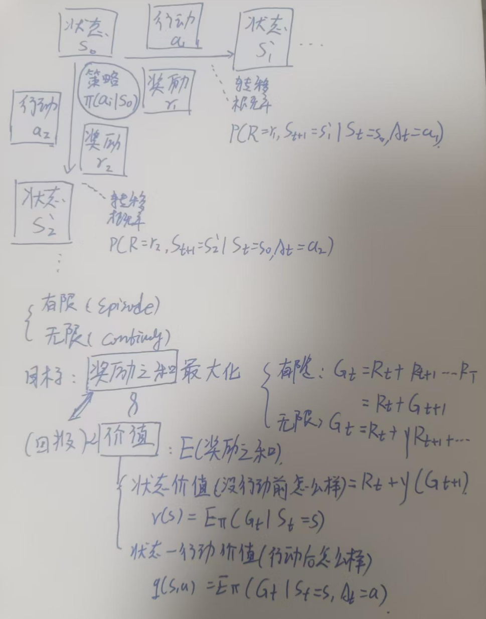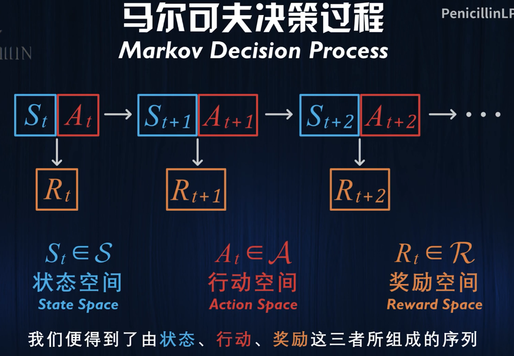 由此,我们明确了状态 行动 奖励三者的数学定义,并通过马尔可夫状态转义函数描述了他们之间的动态关系。