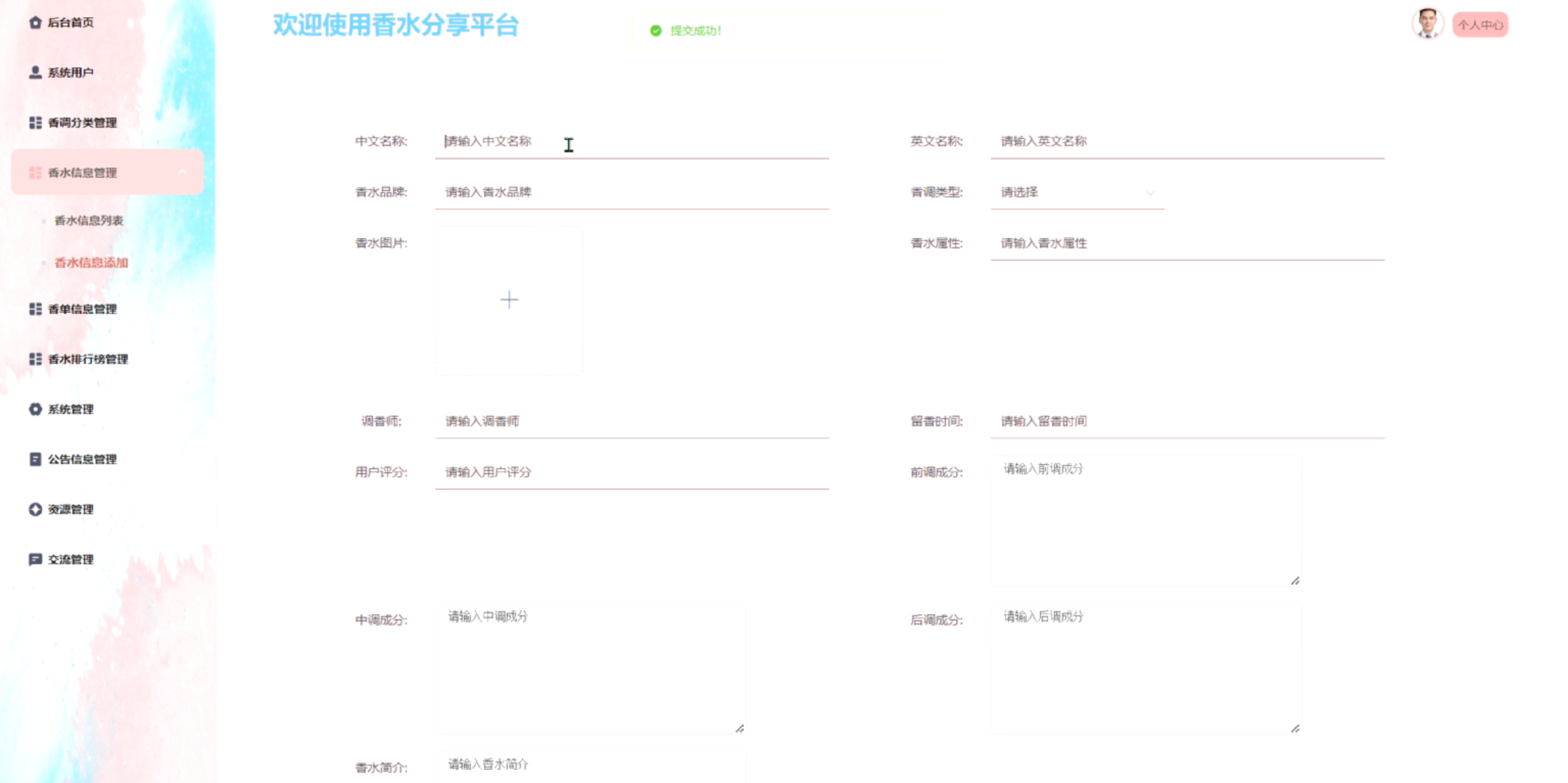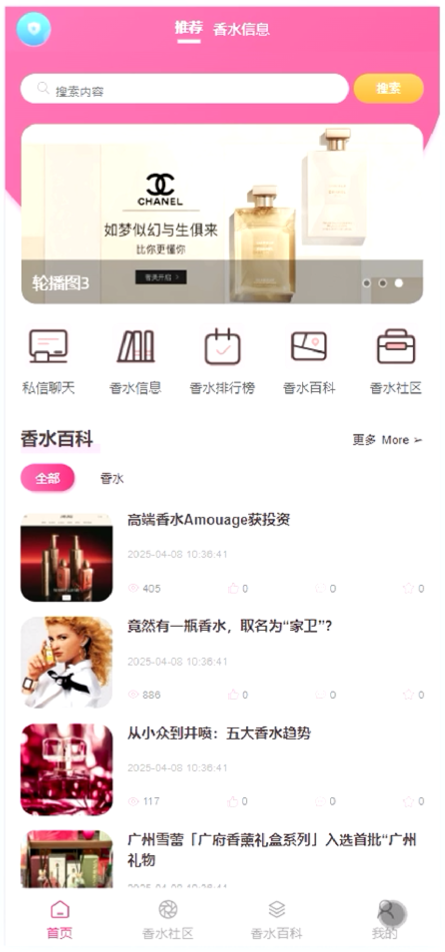 香水作为一种独特的个人配饰,不仅能够增添个人魅力,还能表达个性与情感。随着互联网技术的发展和移动设备的普及,用户获取香水信息的方式从传统的线下体验逐渐转变为线上浏览和交流。然而,现有的香水分享平台在功能性和用户体验上仍存在诸多不足之处,如香水信息更新不及时、用户互动性差、个性化服务缺乏等。因此,设计并实现一个集香水信息查询、用户互动、个性化推荐以及后台管理于一体的香水分享平台显得尤为重要。这样的平台不仅能帮助用户更好地了解香水文化,发现心仪的产品,还能为用户提供一个分享心得、交流感受的空间。