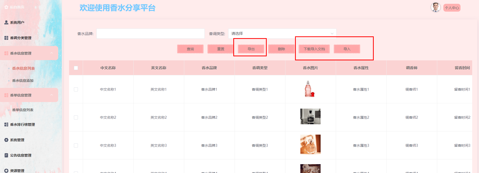 The design and implementation of perfume sharing platform aims to provide users with a comprehensive service platform integrating perfume information browsing, communication and interaction, personalized collection and management. Developed based on the Spring Boot framework, the platform not only supports the detailed inquiry and interaction of perfume information by ordinary users after registration and login, such as private message chat, joining the fragrance list, commenting and liking, but also provides functional modules such as perfume ranking, perfume encyclopedia and community forum, greatly enriching the user experience. In addition, a series of background management functions have been designed for administrators, including but not limited to system user management, perfume information management, announcement information release and sensitive word filtering, etc., to ensure the accuracy and security of the platform content.
