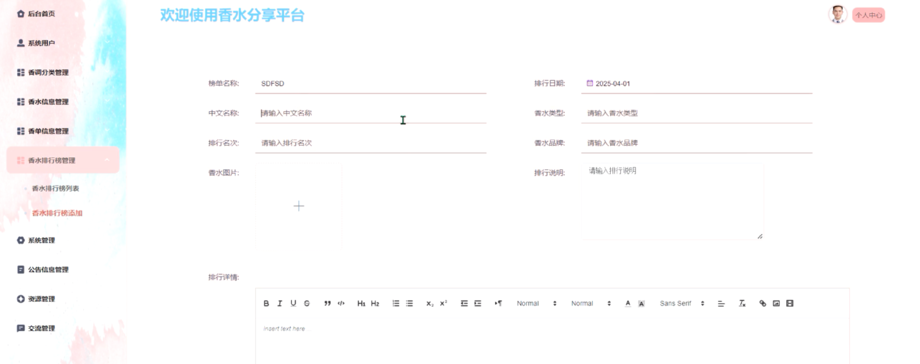 At the technical level, by using Spring Boot as the core framework, the perfume sharing platform realizes the separation of the front and back ends, and improves the scalability and maintenance of the system. The small program side provides users with a convenient mobile terminal entrance, allowing users to access platform resources anytime and anywhere. In particular, the perfume information addition page and management system make the update and maintenance of perfume data simple and efficient, while the rotation chart management and sensitive word management functions further enhance the user experience and the security of the platform. The entire project demonstrates a deep understanding and responsiveness to the needs of perfume lovers, while also demonstrating the power of modern Web development techniques in building complex business logic and services.