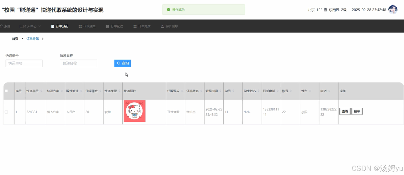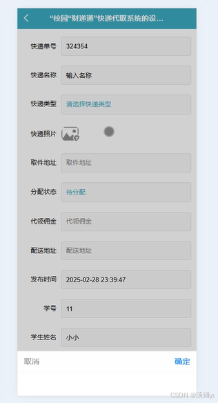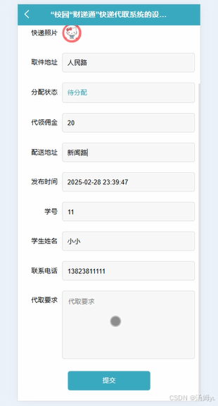 传统校园快递服务存在站点分散、人员调配不合理等问题,导致快递积压、配送延迟。该系统可整合校园内代取人员资源,根据订单需求合理分配任务,实现快递的快速流转和精准配送。同时,通过小程序实时更新快递状态,方便师生查询,减少无效等待和沟通成本,提高整个校园快递服务的运营效率。