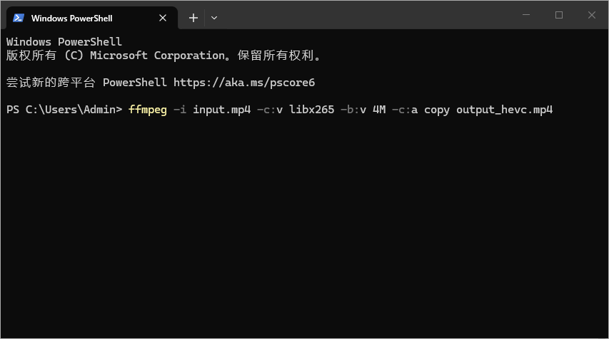 ffmpeg -i input.mp4 -c:v libx265 -b:v 4M -c:a copy output_hevc.mp4