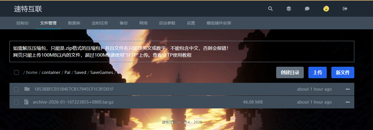 然后找到文件管理,找到自己服务器中存储幻兽帕鲁存档的文件夹,一般都是文件夹“0”下面的文件,该文件是一串编码,一般的地址为