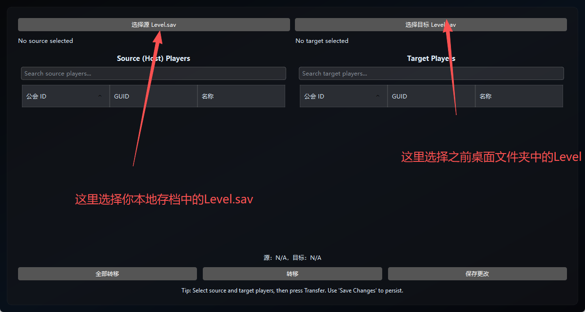 5.选择好后会出现存档中所有出现的角色,由于之前进入存档创建了一个角色,那么左边就点击刚刚新建的角色,右边点击原来服务器中你原本的角色,然后点击转移,会提示转移成功,再点击保存更改即可。由于我以及修改完成,所以没有截图了。