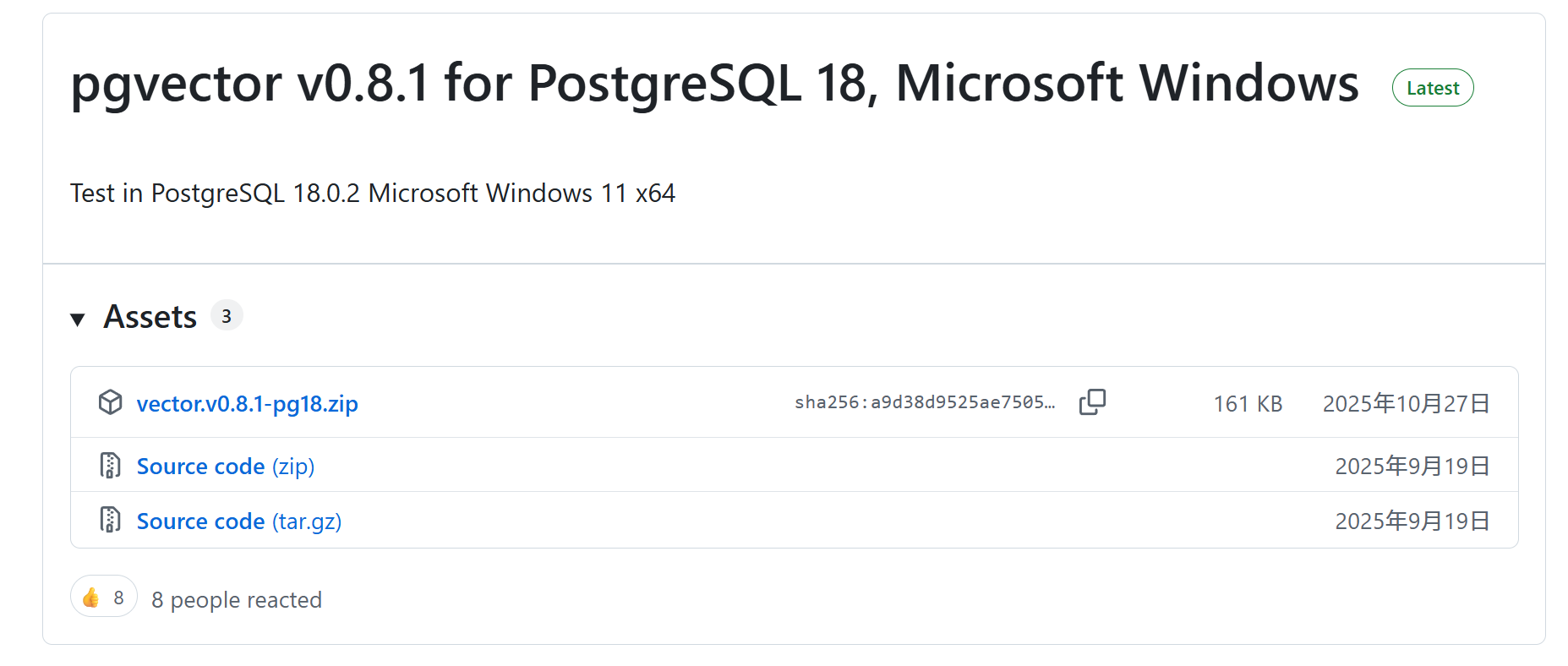 https://github.com/andreiramani/pgvector_pgsql_windows/releases?page=1,进入查看对应版本。比如PostgreSQL18版本,这里就选择下载vector.v0.8.1-pg18.zip。
