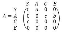 那如果,我们在邻接矩阵元素只标记为0/1的基础上,把记号改为具体的实义符号,那对于有值的格子,它的意义就变成了“点x在遇到什么符号后会跳转到点y”。
