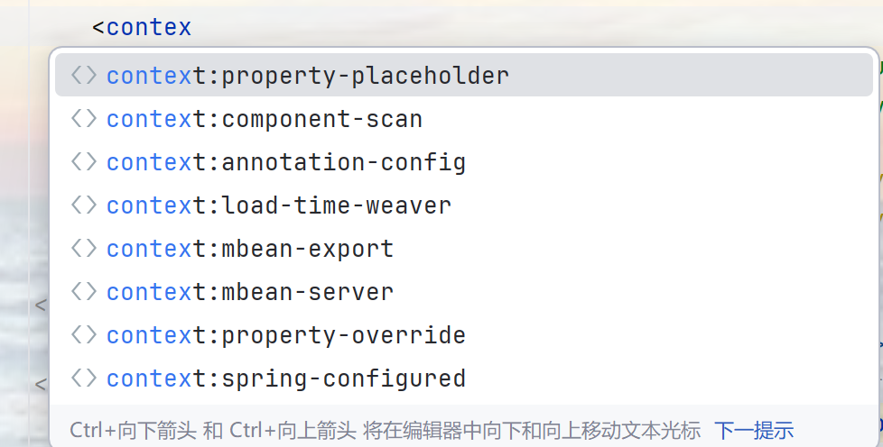 http://www.springframework.org/schema/context/spring-context.xsd"”是加载约束的映射地址 ,先是命名空间加空格,再是命名空间加“/spring-context.xsd”,(xsd也就是schema地址)其作用是命名空间约束,同时来说就是我们在使用命名空间标签时它会提示改命名空间有哪些标签: