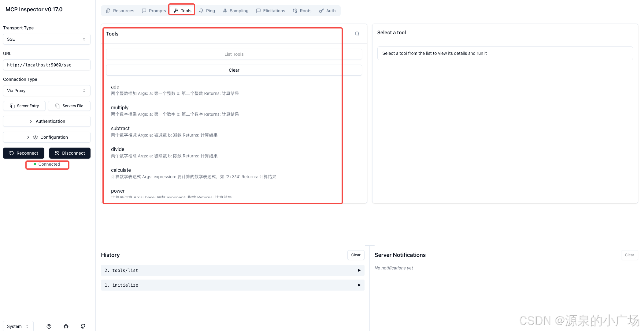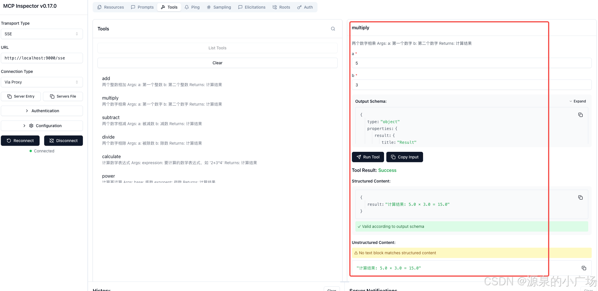 可以看到,我们已经连接到我们的mcp server服务,并且已经拿到了一系列工具,接下来随便选一个函数进行执行验证结果: