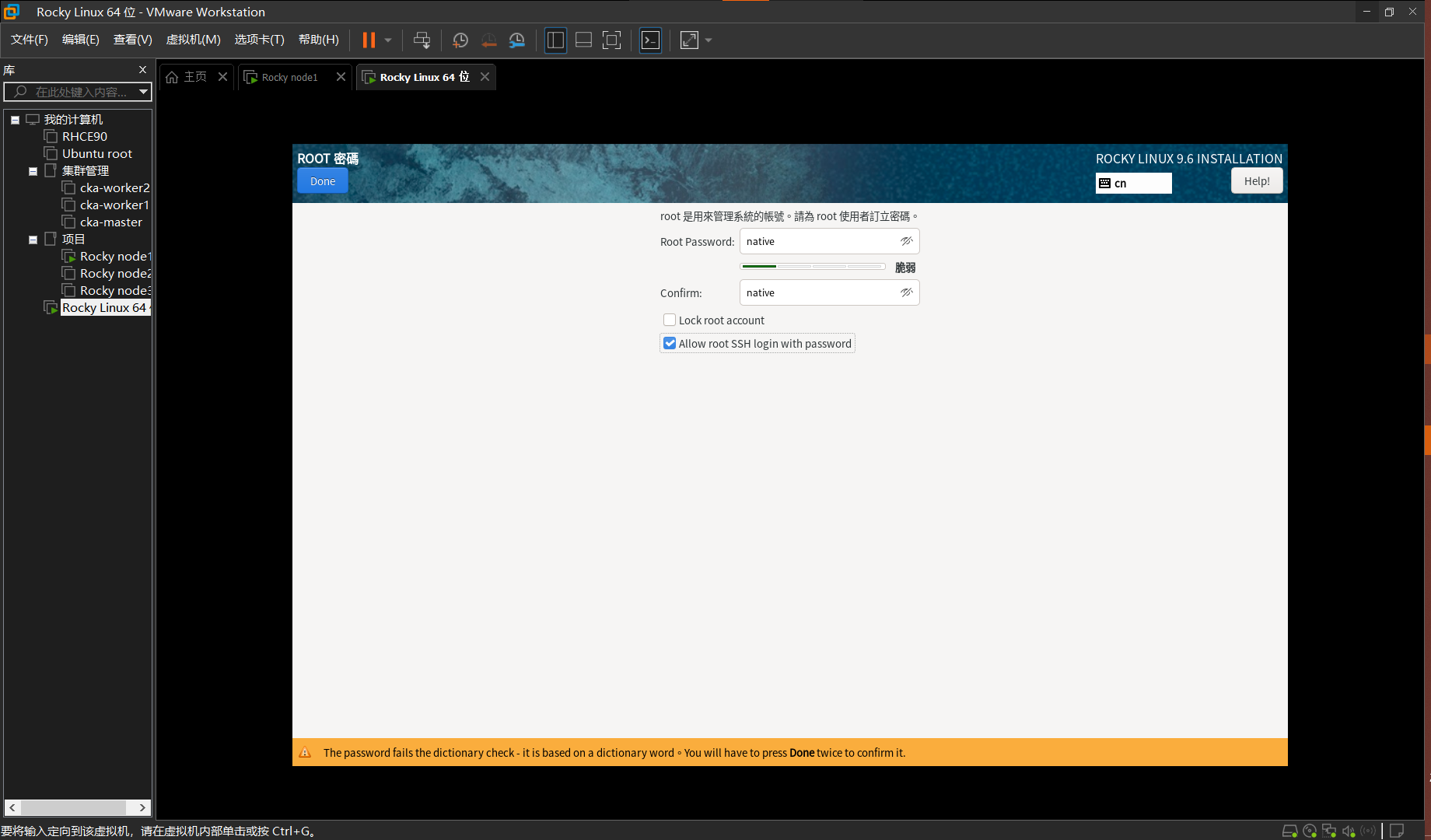4. 先配置超级用户(Root Password)填写用户密码,并且打开ssh远程登录(第二个勾选项),在填写完成后点击左上角Done按钮,此处如果密码比较简单,需要按两次按钮以确认。