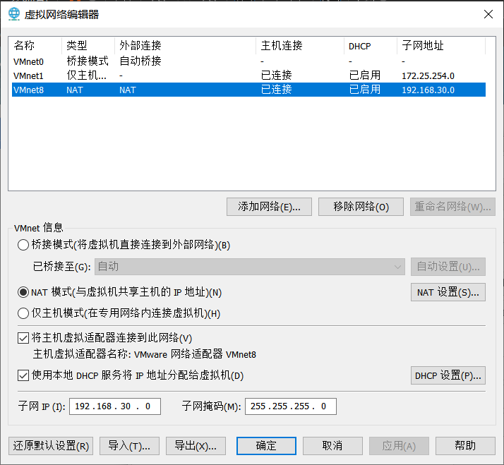 选ipv4配置,点击Add按钮新增连接,此处的ip应当参照你的计算机设置,点击VM左上角的编辑,选择虚拟网络编辑器,你应该有一个NAT类型的连接,如果没有可以通过添加网络创建,选中此连接点击NAT 设置,查看你的Vmware网络配置