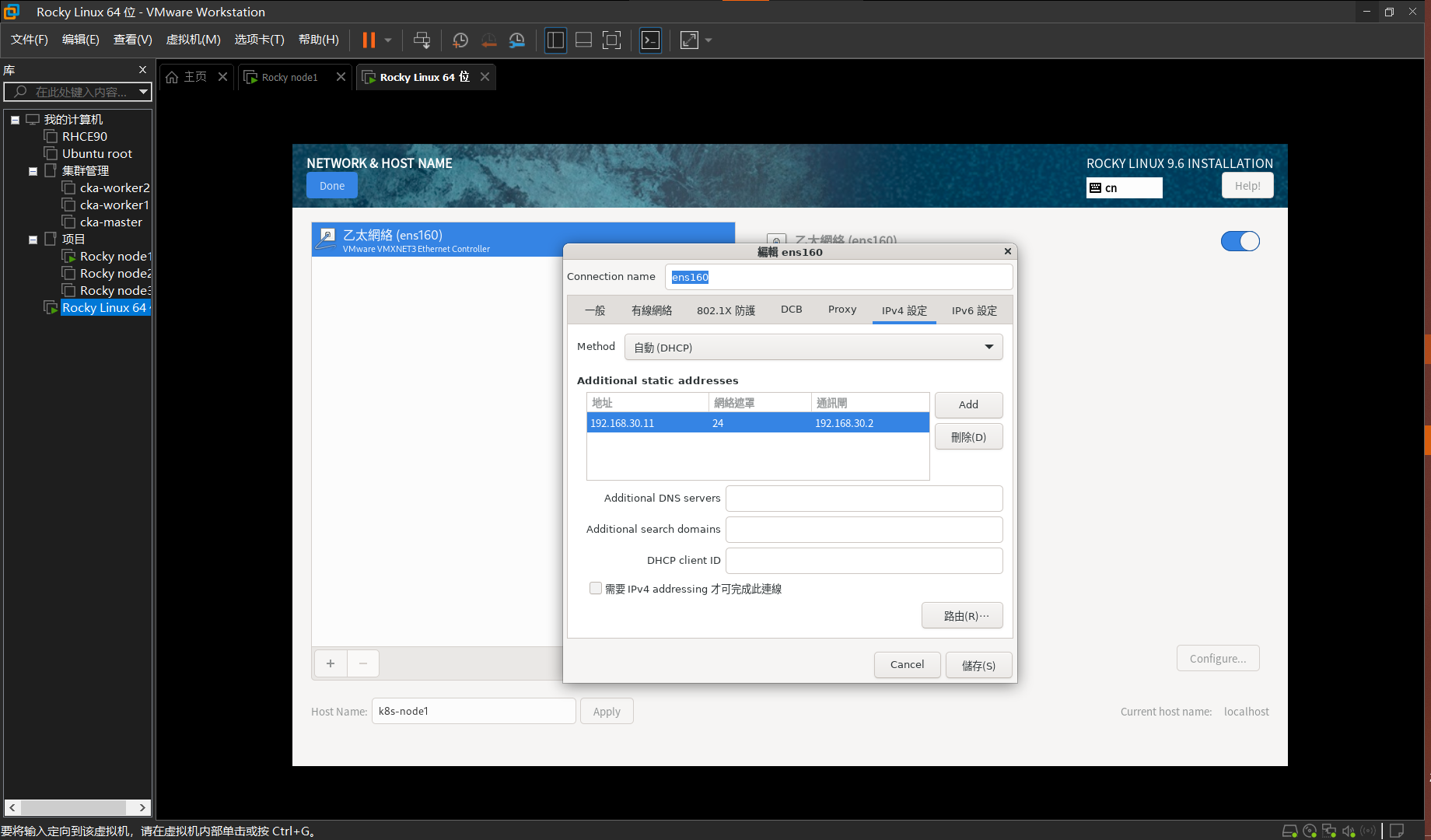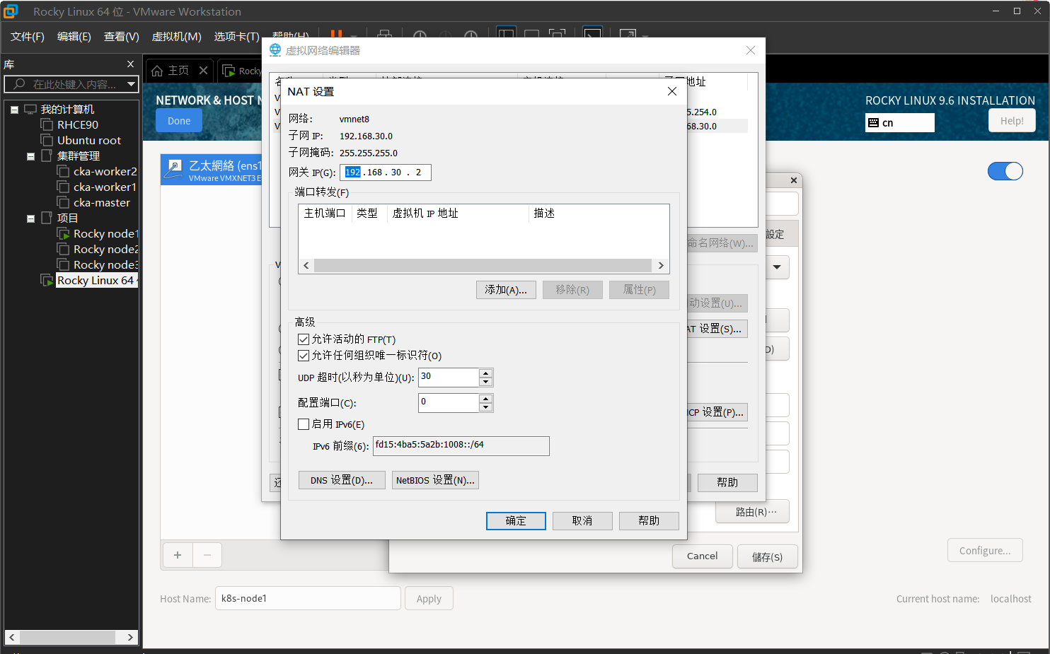 7.配置网络:在下方主机名处修改主机名为k8s-node1,并应用,再点击右侧配置按钮