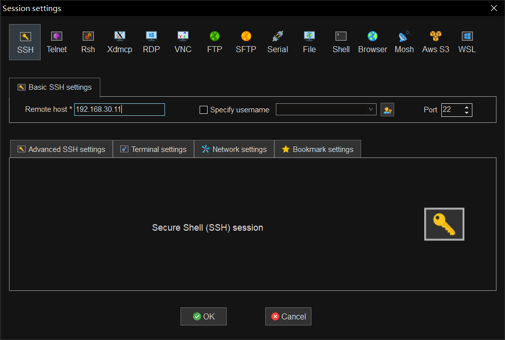 2. 选择SSH,在remote host中输入虚拟机的IP(上文配置的ip,我的是192.168.30.11),点击ok